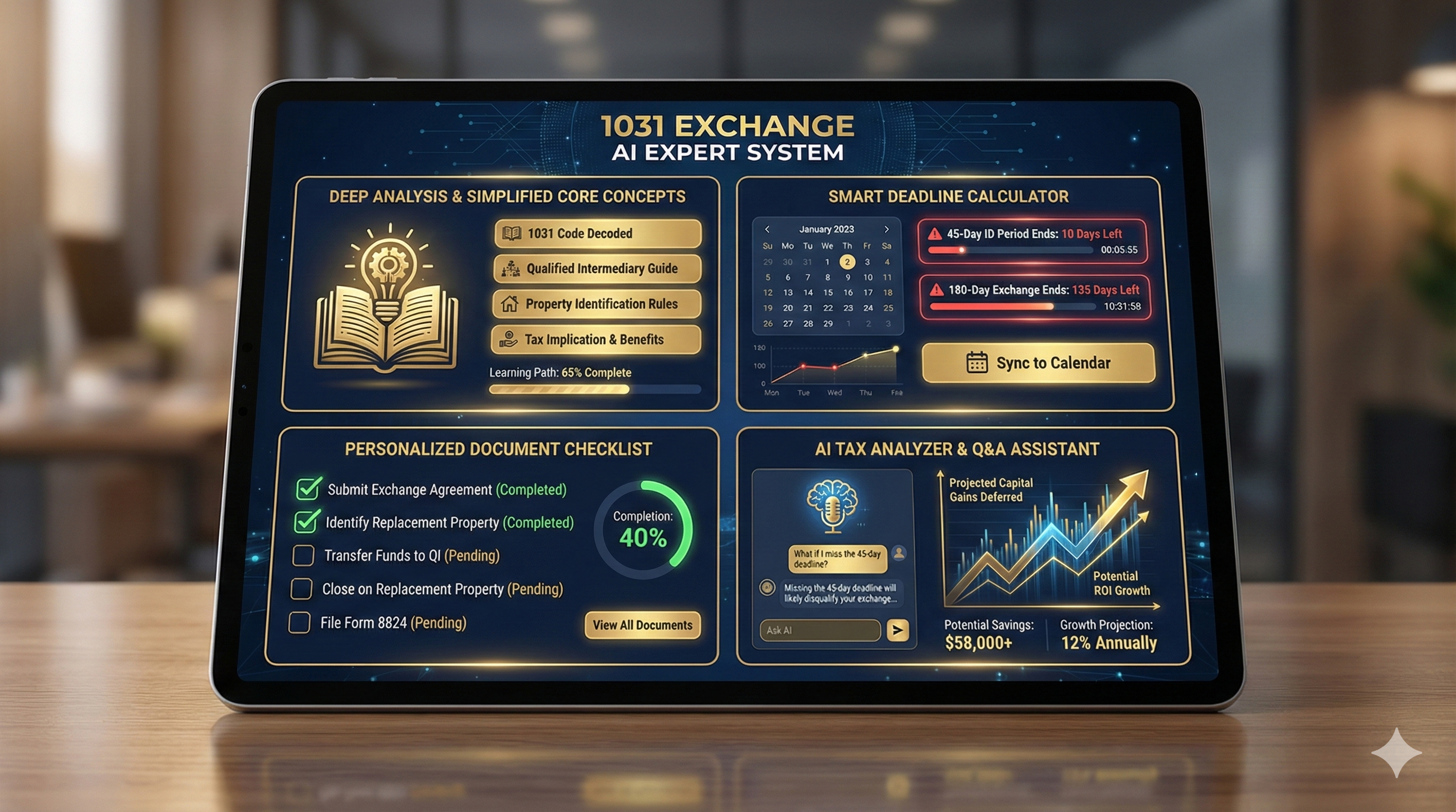 告别通用的“傻瓜AI”,拥抱专为 1031 定制的专家系统。这不是一个简单的文档,而是一套集成了关键日期计算、税务模拟与智能避坑清单的实战工具。帮您理清复杂的置换规则,确保交易零失误。